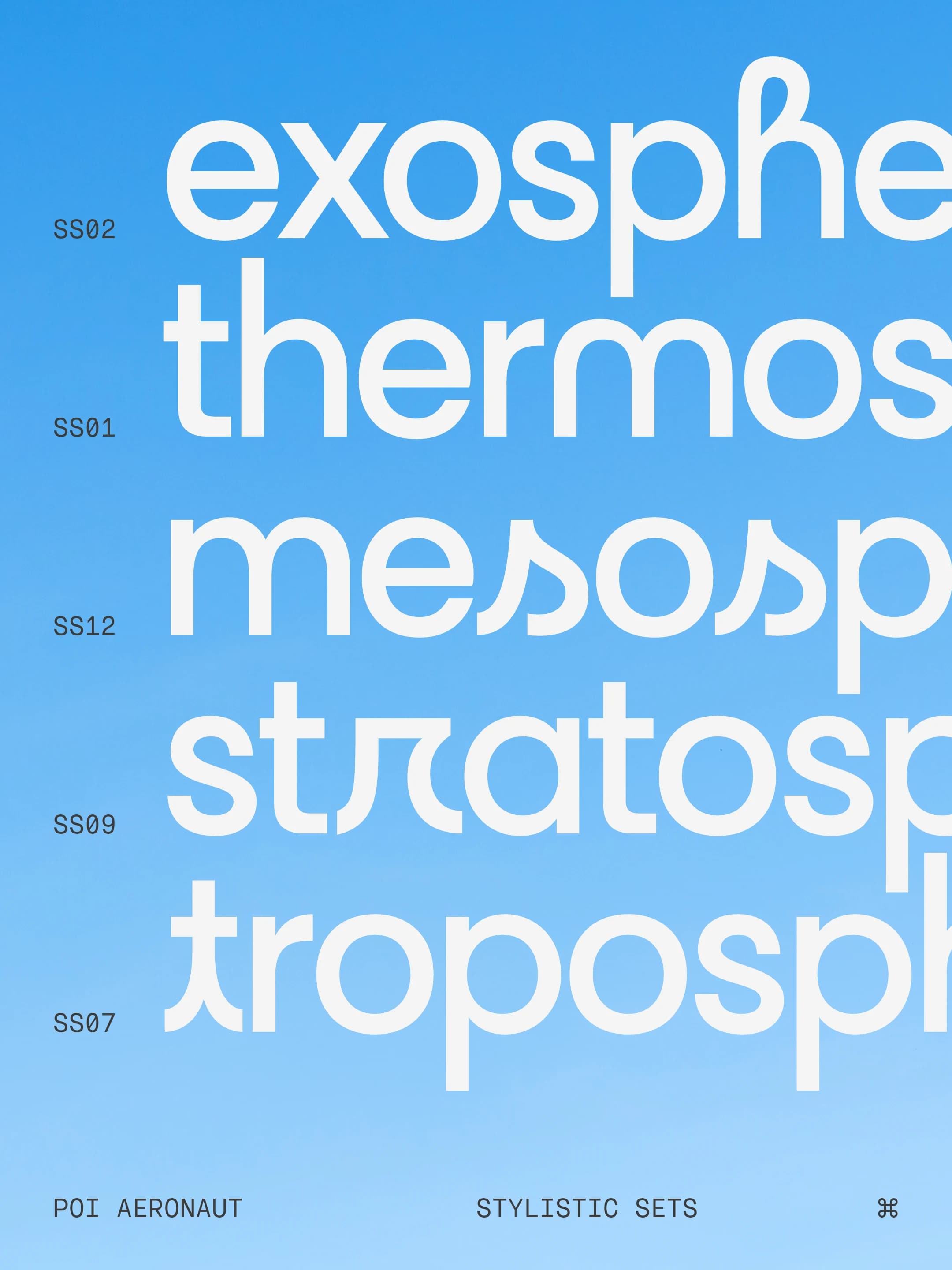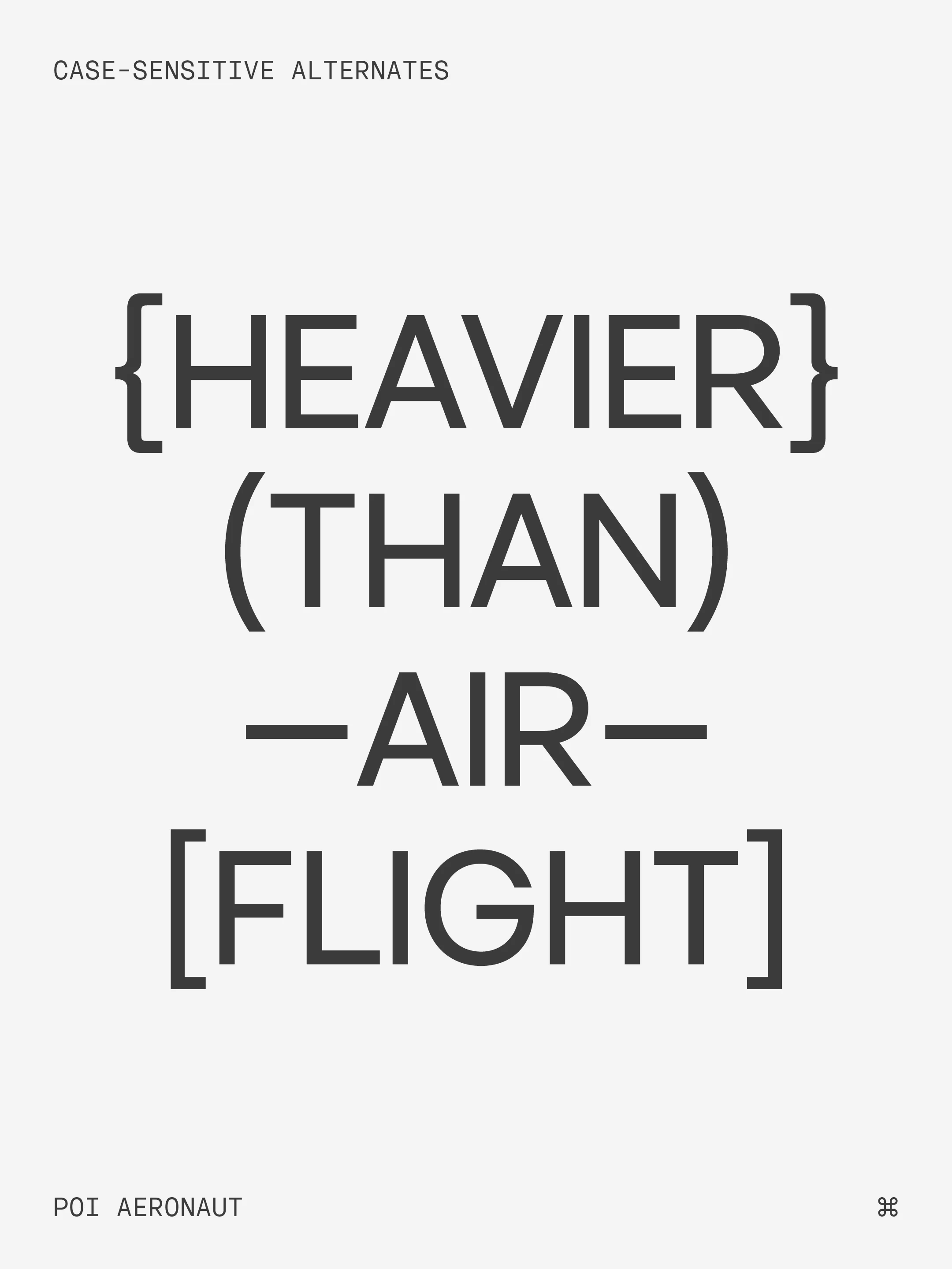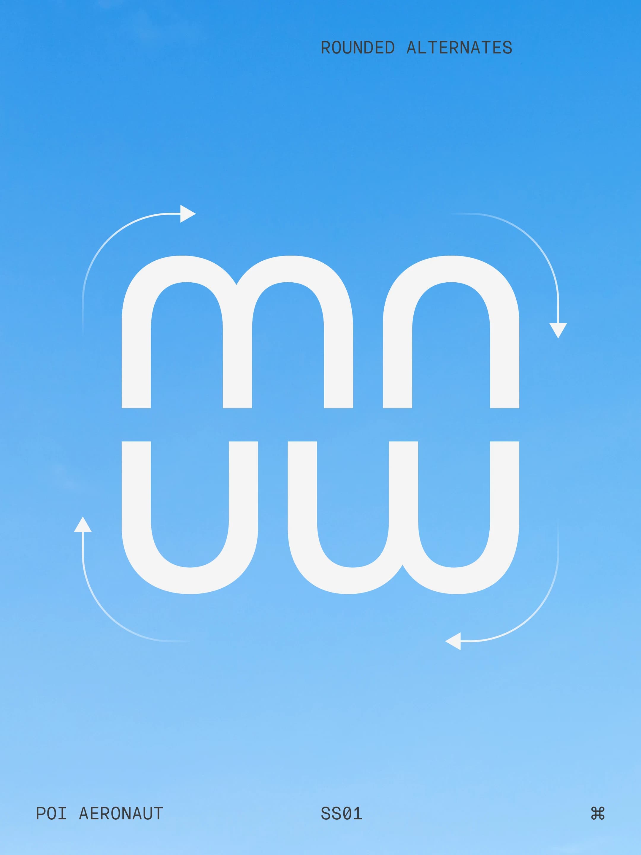 This geometric sans, inspired by cursive practice sheets, brings warmth and whimsy to a genre that historically lacks it. Arrows, originally intended to guide the student's hand, draw parallels to aerodynamics, the typeface's namesake. Best suited for expressive messaging, Aeronaut includes 12 stylistic sets, giving you full creative control.
