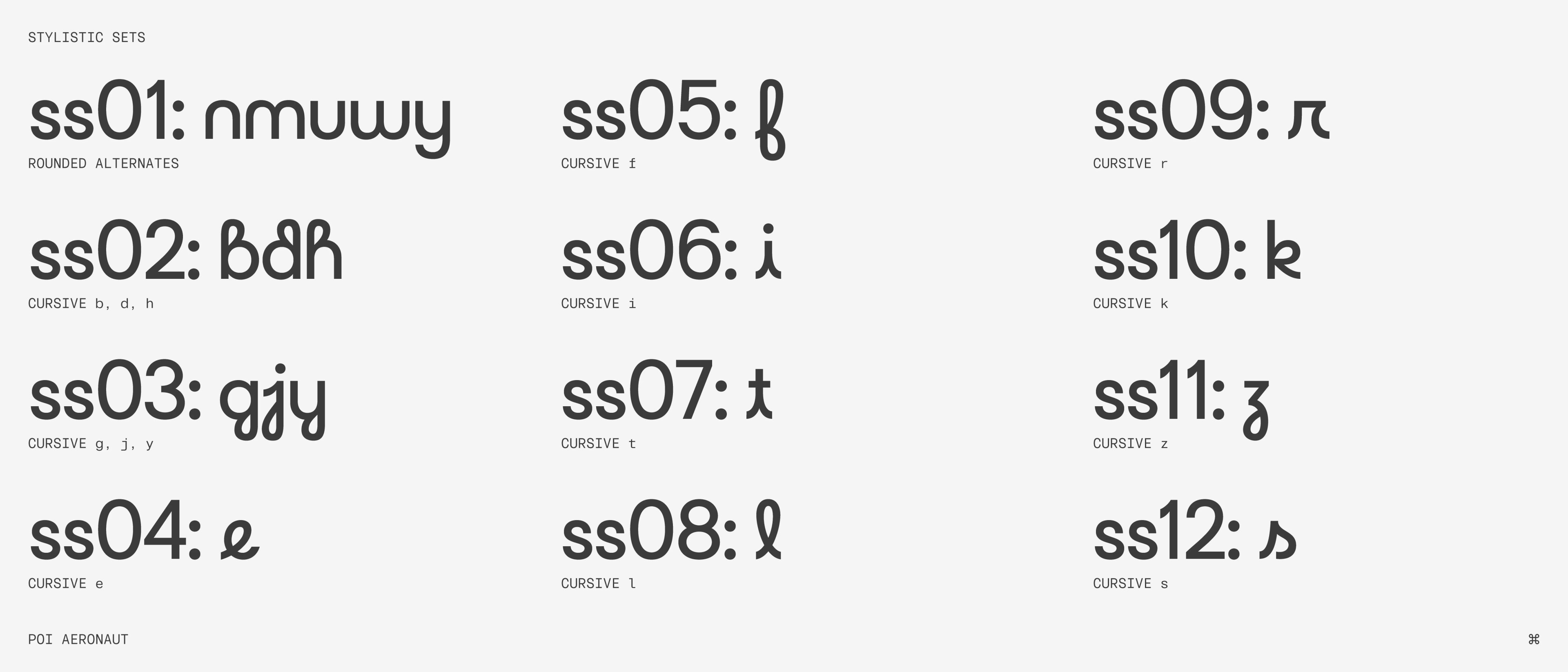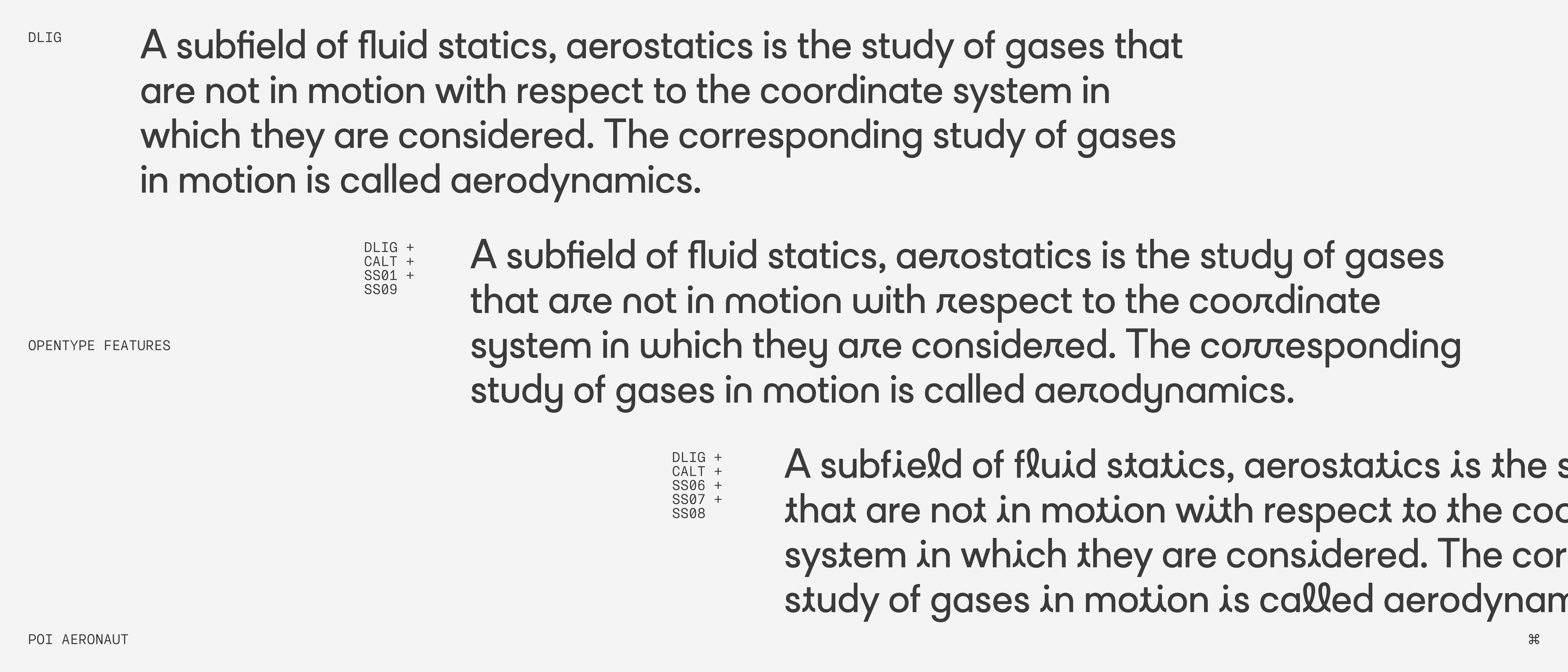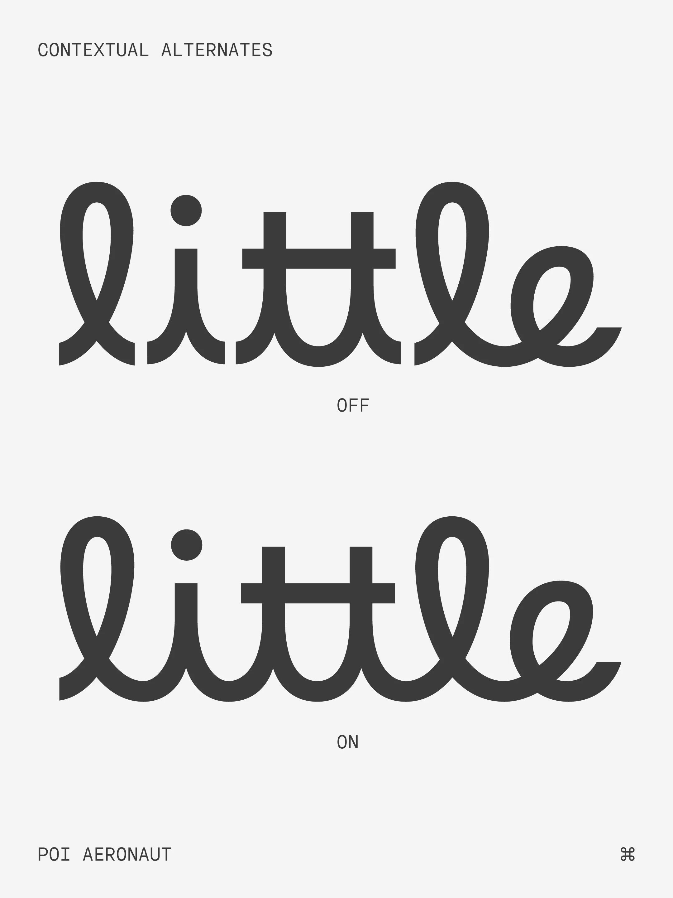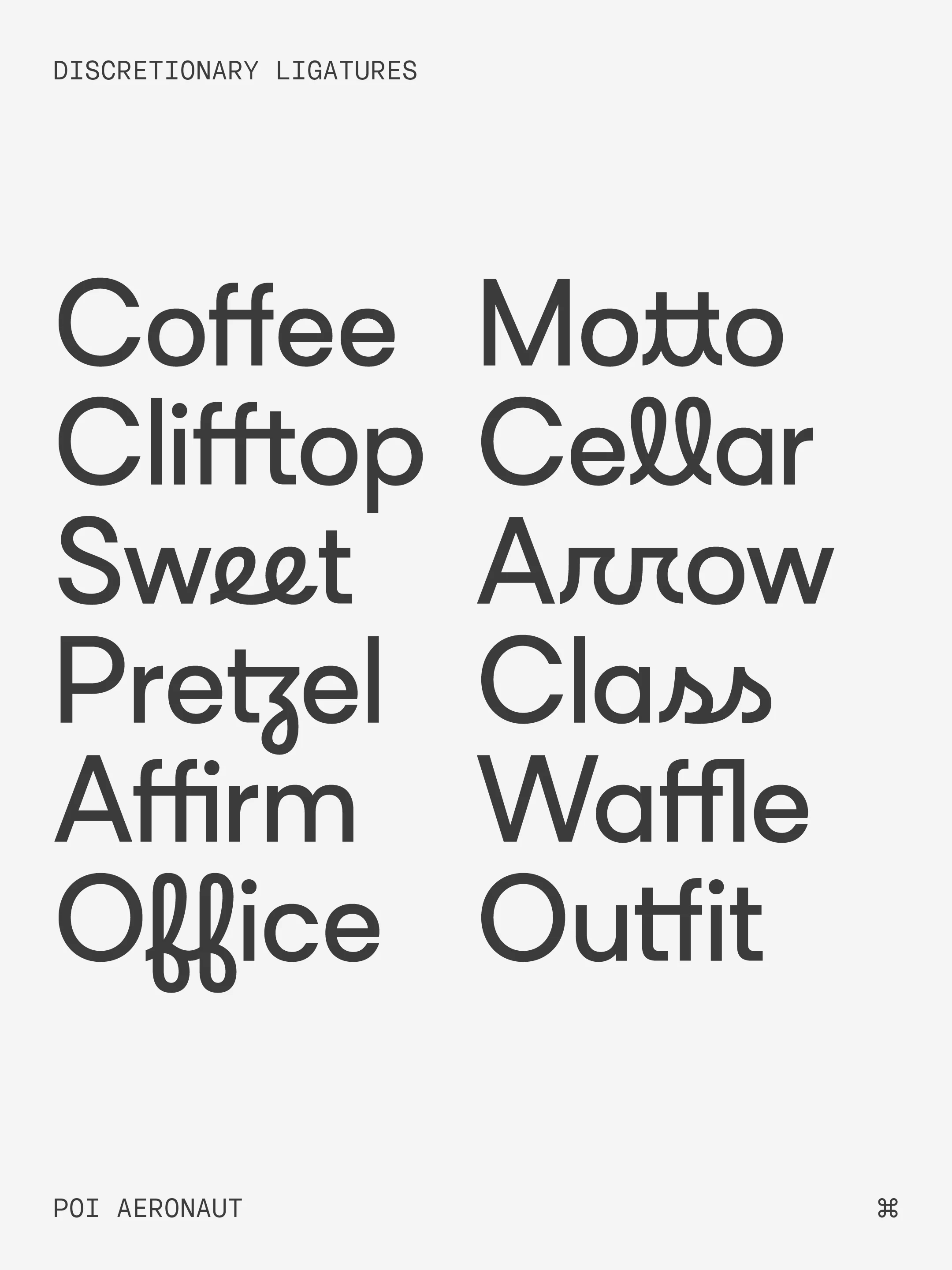 This geometric sans, inspired by cursive practice sheets, brings warmth and whimsy to a genre that historically lacks it. Arrows, originally intended to guide the student's hand, draw parallels to aerodynamics, the typeface's namesake. Best suited for expressive messaging, Aeronaut includes 12 stylistic sets, giving you full creative control.
